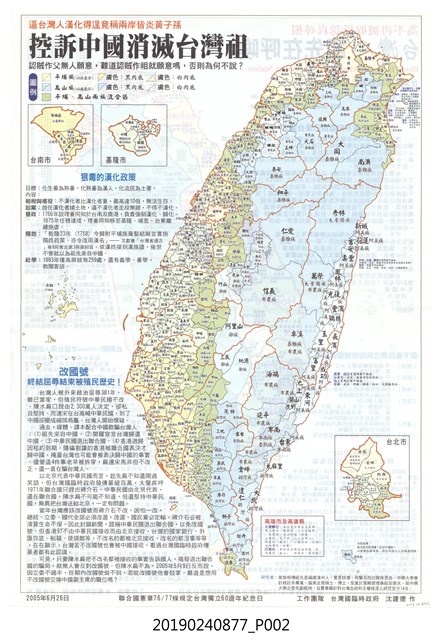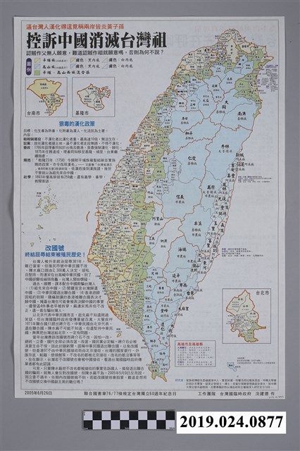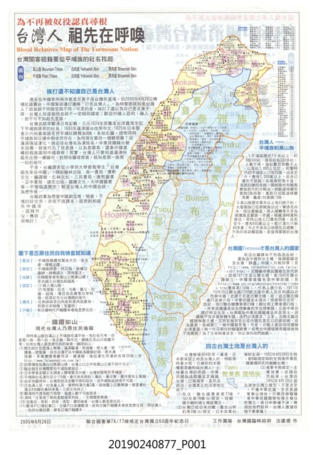 1.此文物為柯蔡阿李收藏之台灣國臨時政府文宣〈台灣平埔高山原住民分布地圖〉,由台灣國臨時政府招集人沈建德於2005年6月26日製作(第四版),初版為2000年1月21日,為該組織2004年出版的〈台灣血統真相地圖〉與〈台灣閩客尋根地圖〉的修訂縮小版,本地圖文宣主要傳達過去漢化政策的狠毒以及控訴中國消滅台灣祖先一事,圖中以顏色區分平埔與高山在台灣的分布地區,而在下方註有短文表達對當時總統陳水扁對於改國號一事退縮的批評。另一面則是論述舉例證明現代台灣人為原住民後裔,教學如何檢測自己居住地區或特徵是否為原住民等內容,相同的文件共有9張,雙面彩色印刷。2.柯旗化在出獄後,於第一出版社成立「台灣文化圖書服務部」、創辦《台灣文化》季刊,積極為台灣意識或獨立發聲,柯旗化除了向報章雜誌投稿不少政治社論外,也將自己撰寫的詩篇投稿在當時台獨團體發行的刊物中,成為柯旗化晚年的活動重心,而柯蔡阿李在柯旗化逝世後,是積極保存所有柯旗化相關活動等報導與文件,收藏得相當完整,對柯蔡阿李而言,這些文件是對柯旗化台灣意識的理想最好的見證與傳遞,也是她對於已逝的丈夫的一種紀念,透過細心的收藏過程中,也印證了柯蔡阿李生命史的歷程。