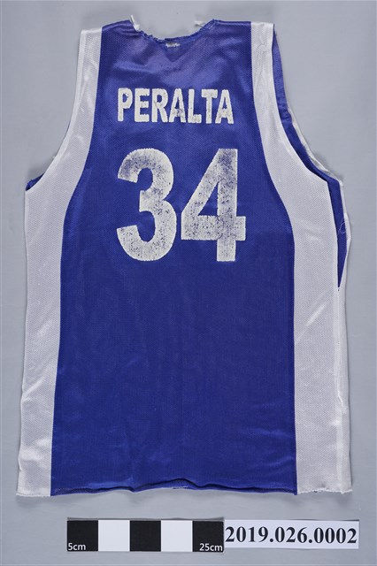 此件籃球球衣原物主為菲律賓籍移工Ching Peralta (阿清)。此球衣以藍白兩色的布料拼縫而成,為塑膠纖維材質,正面印有菲律賓汽油公司Unioil 的企業標誌及數字34字樣。背面印有原物主姓氏Peralta及數字34字樣。此件籃球衣為阿清來臺之前所就職公司的球隊球衣。根據他的說法,Unioil 和其他有業餘籃球隊的菲律賓公司有個籃球比賽聯盟,而他是公司的球員之一。他很珍惜這段打球的經歷,也因此這件球衣是重要的紀念物,來臺工作也帶在身上。此物件呈現代表著離鄉背井的人們建構自我認同以及連結家鄉記憶的重要紀念物。