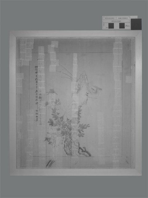 此彩繪牆板位於正廳龍邊後側,畫心繪有牡丹與雀鳥(疑似),象徵著富貴與吉祥的寓意,彩繪狀況表面有明顯霧白的現象,整片牆片無被破壞之痕跡,左側落有款,可明顯辨識出為甲子年郭新林繪。