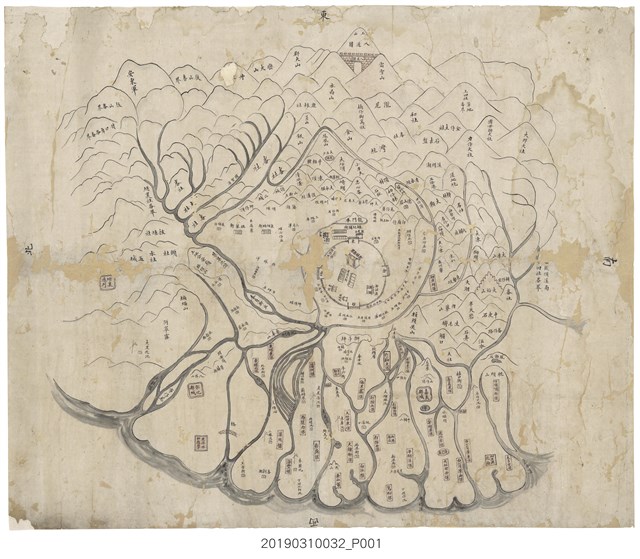 為以林杞埔為中心的雲林縣治下手繪地圖,上方(地圖的東方)有標示八通關、玉山。本批有兩張內容類似,疑均為草稿而留在陳上達處,本件線條較為清楚。
