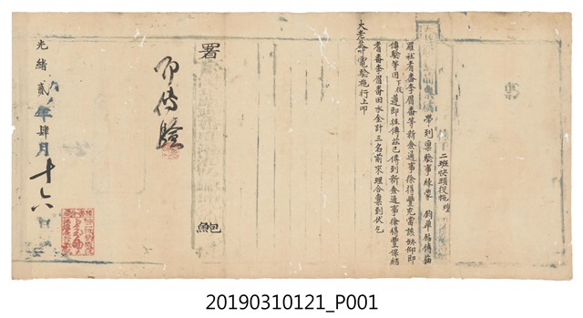 光緒貳年肆月十六日署鮑傳徐得豐等人前來理合稟到文件