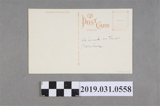 1.本物件為巴拿馬太平洋萬國博覽會風景明信片。繪製博覽會場內臺灣喫茶店建築,為平脊重檐木造建築,屋頂中央頂端和門口上方各有1塊淡藍色倒梯形和褐色扁橢圓招牌,招牌都書寫「FORMOSA TEA HOUSE」(按:福爾摩沙茶屋)字樣,建築左前側和左側屋簷各裝置1個淡藍色茶壺模型,建築左側搭有棚子,左上角書寫白色「FORMOSA TEA HOUSE, JAPAN GARDEN」(按:日本園區臺灣茶屋)、「PAN-PAC. INT. EXPOSITION」(按:巴拿馬太平洋萬國博覽會)、「SAN FRANCISCO」(按:舊金山)、「1915」等4排字;另一面為明信片,左上部書寫「POST CARD」(按:明信片)字樣,左半部為通信欄,右半部為收件人、住址及郵票黏貼處。 2.為慶祝巴拿馬運河竣工,以及展示1906年舊金山大地震的重建結果,1915年2月20日至12月4日間,美國在舊金山舉辦為期288天的巴拿馬太平洋萬國博覽會。總督府為推廣臺灣物產,特別選出111項官方及民間出產的商品參展。同時得到實業家古谷竹之助贊助2萬圓,於會場內開設臺灣喫茶店。博覽會期間大獲歐美人士好評,總計吸引將近22萬人次入場。