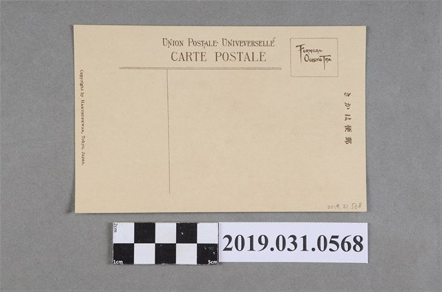 本物件是風景明信片,紙製品。主題是富嶽三十六景,可看到富士山之處,風景是相州箱根湖水,下方有「By Hokusai」(按:葛飾北齋,18世紀末至19紀世紀中著名的浮世繪師)的落款。下方有「Compliments of Formosa Oolong Tea」字樣(按:臺灣烏龍茶的頌讚)。