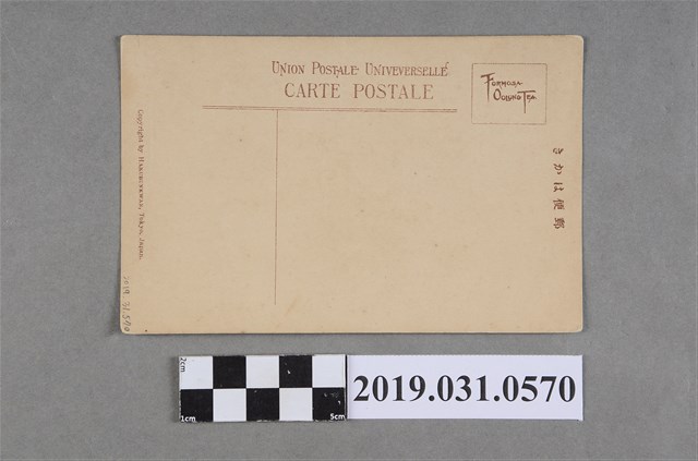 本物件是風景明信片,紙製品。主題是富士三十六景,可看到富士山之處,風景是東都佃沖,下方有「By Hiroshiga」(按:歌川廣重,19世紀前半葉著名的浮世繪師)的落款。上方有「Compliments of Formosa Oolong Tea」字樣(按:臺灣烏龍茶的頌讚)。
