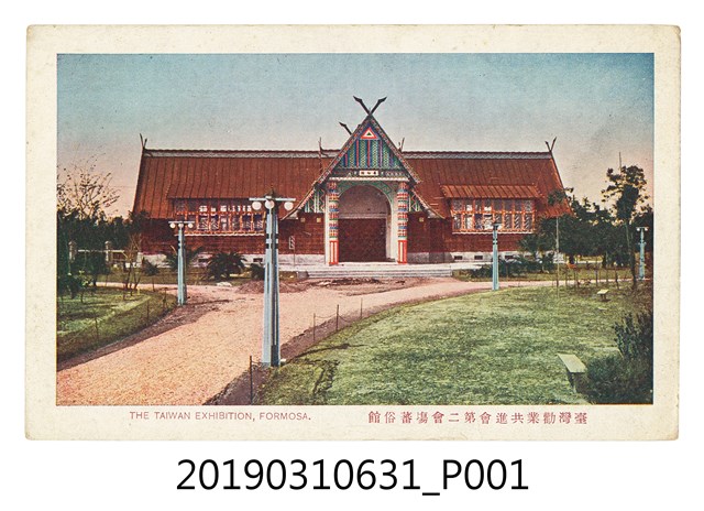 1.本物件為臺灣勸業共進會蕃俗館風景明信片。風景明信片為位於第二會場蕃俗館,其為斜頂1層樓建築,大門突出三角頂前檐,並裝飾原住民意象圖紋。照片右下端由右而左橫書「臺灣勸業共進會第二會場蕃俗館」之紅色題名;左下端為「THE TAIWAN EXHIBITION, FORMOSA.」英文(按:福爾摩沙臺灣博覽會)。