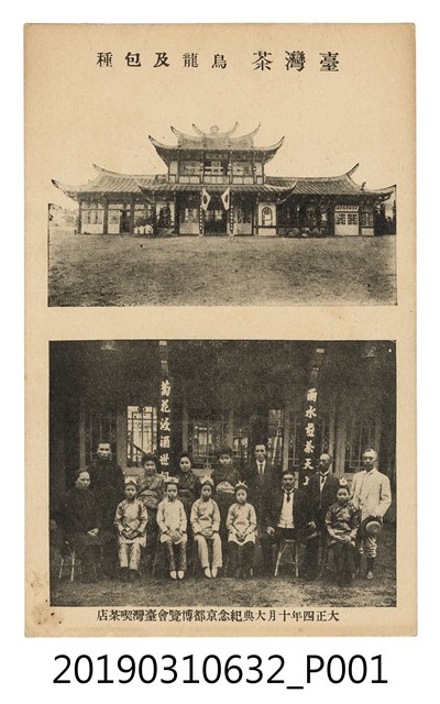 1.本物件為大典紀念京都博覽會臺灣喫茶店明信片。上方照片為大典紀念京都博覽會臺灣喫茶店建築,其由三棟三開間的建築組成,中間建築仿赤崁樓形式,大門立有1對日本國旗,對柱刻有對句;兩側為1層樓建築,燕尾脊。下方照片為臺灣喫茶店前合影,合影者有14人,7人坐於前排,其中5名女童是喫茶店服務生;7人站在後排。照片下端中央有由右而左橫書之「大正四年十月大典紀念京都博覽會臺灣喫茶店」字樣。