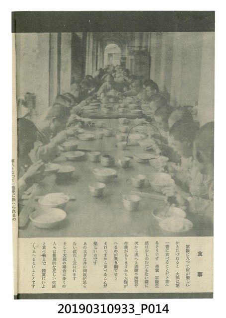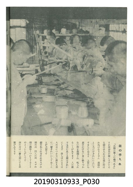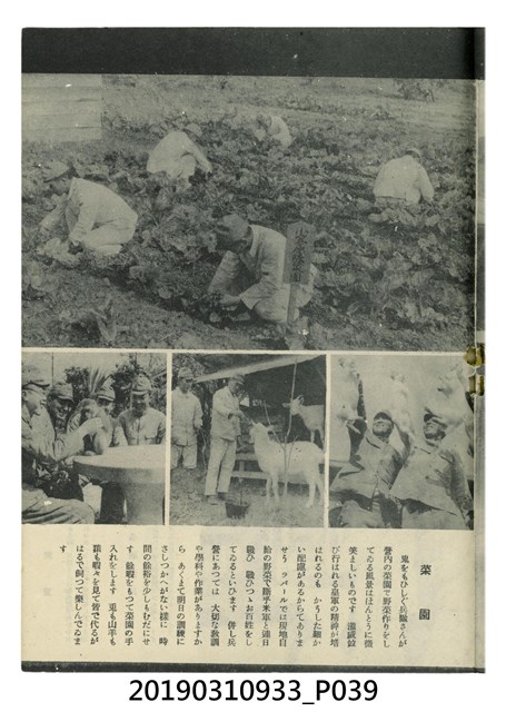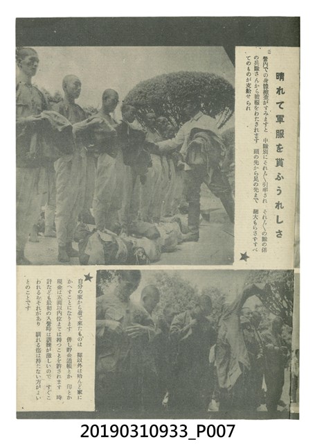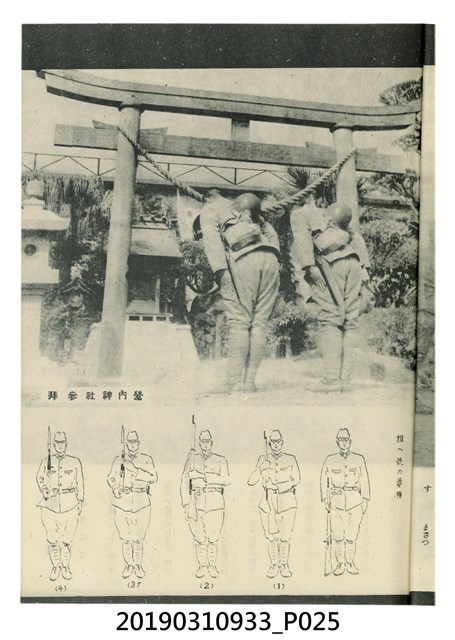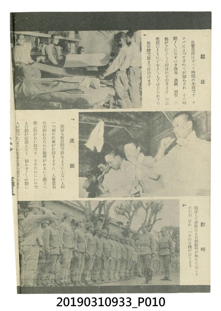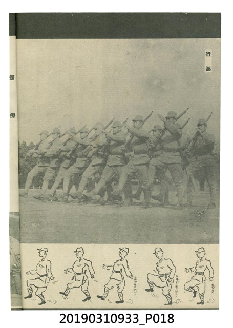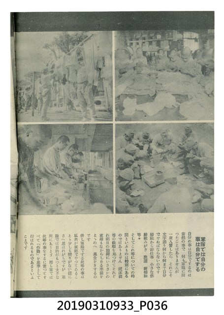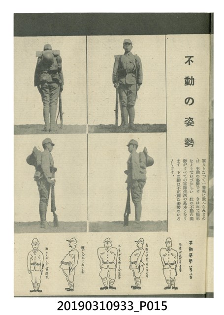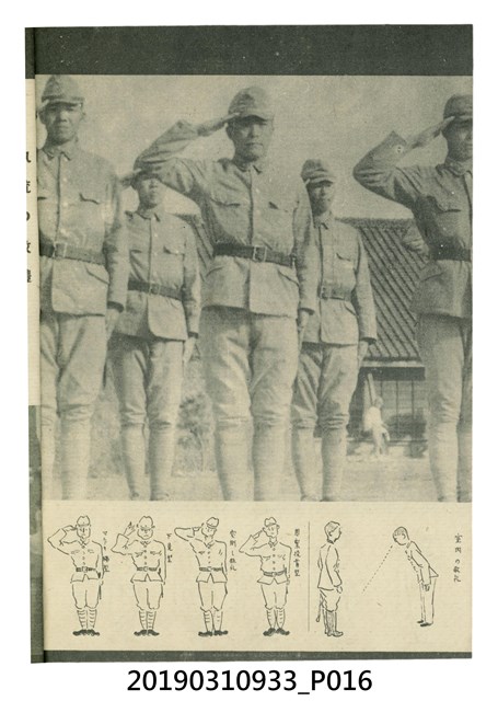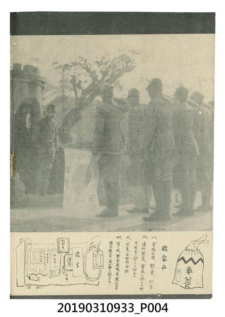 2. 本件刊物內也展示軍隊的生活,包含起床、洗臉、點名、敕諭奉讀、在軍隊旁的準備等照片,另有各種軍階的徽樣、軍職名稱以及奉公袋中的收容品;奉公袋內應有軍隊手牒、勳章、記章、適任證書、軍隊特業教育相關證書、召集點呼令狀、遺書、遺髮、印鑑、敕諭集與其他貯金帳等應召準備等物品。