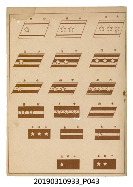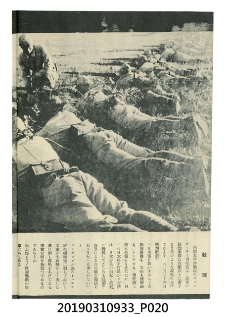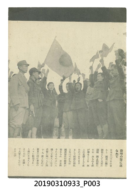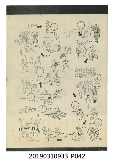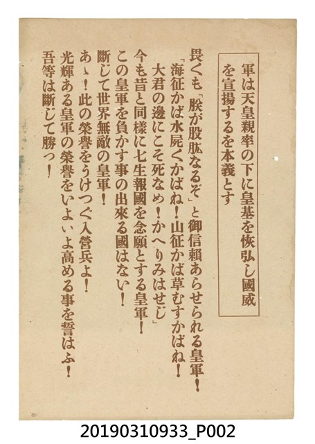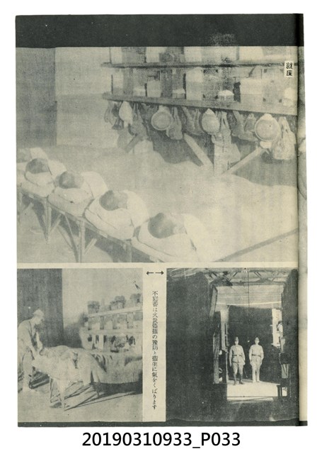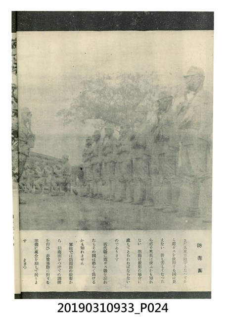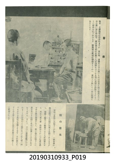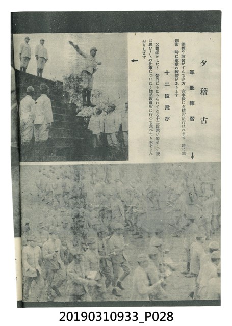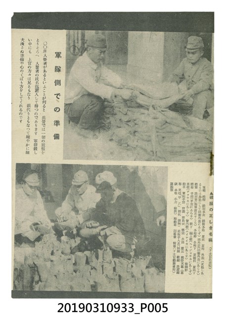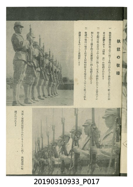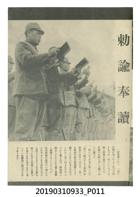 2. 本件刊物內也展示軍隊的生活,包含起床、洗臉、點名、敕諭奉讀、在軍隊旁的準備等照片,另有各種軍階的徽樣、軍職名稱以及奉公袋中的收容品;奉公袋內應有軍隊手牒、勳章、記章、適任證書、軍隊特業教育相關證書、召集點呼令狀、遺書、遺髮、印鑑、敕諭集與其他貯金帳等應召準備等物品。