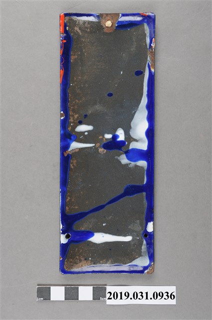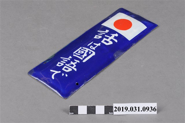 1.本物件是日治後期皇民化時期宣傳使用國語(日語)的鐵製標語牌。鐵牌正面以藍色為底,上方繪製日本國旗,國旗下方由上而下直寫「話は國語で」(按:使用國語交談)標語。