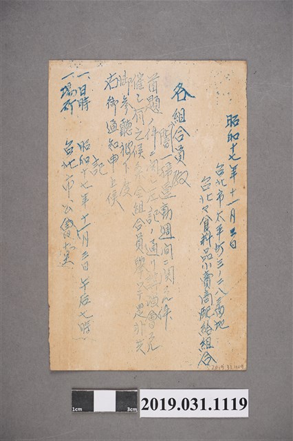 臺北北食料品小賣商配給組合配給通知書與訂購單與調查座談等通知書