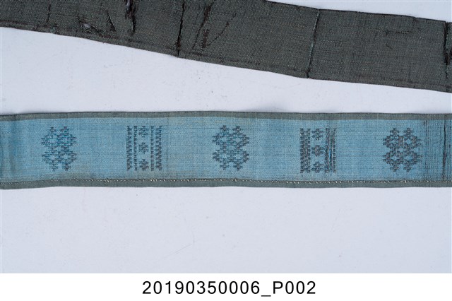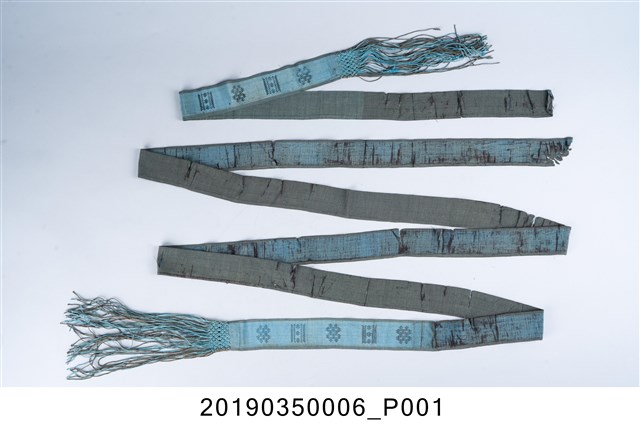 本件腰帶為藍色、長條形,施有方形、菱形之十字繡圖紋,尾端編製有流蘇。