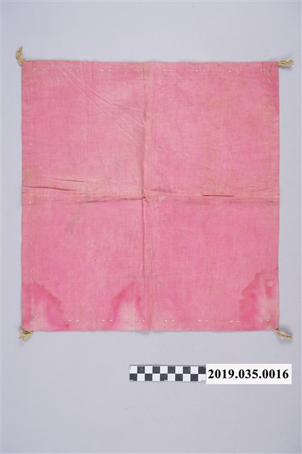 本件手巾繡有花朵圖樣,畫面背景為梅花枝葉,前景繡一扇形物,上有一「壽」字與竹葉圖案;再上方又繡有一長條物,上有日語。 本件原與潘踏比厘等物件收貯在一起,應為潘家某女性成員所有的往昔日常生活物件。然經詢問捐贈者潘怡宏先生後,仍不確定為潘家哪一位女性遺留之物,因此尚待進一步確認。