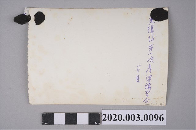 本文物為光復後第一次講習會合照,有14位助產士於新竹縣衛生院外合影的照片,多數為耳際短髮,身穿短袖上衣與裙子。背面寫著「光復後第一次產婆講習會一個月」。日本明治維新後,為了配合富國強兵政策,引進西方醫學。1907年臺灣總督府頒布「助產婦講習規則」,設立講習所,也設置專門培養臺灣產婆的速成科。日治時期臺灣早期婦女的生產方式是以產婆接生為主,產婆因而被賦予開立出生證明,政府藉此掌握人口出生數,為戶政制度奠下基礎。1945年日本戰敗後,國民政府在臺灣施行「助產士法」,對於接生者名稱從產婆改為「助產士」。隨著醫生法公佈,各項醫療措施多以醫生為主,助產士也需在醫師的指導下才能擔任接生工作,經過社會文化與醫療制度變遷,使得產婆所扮演角色漸漸被忽視。