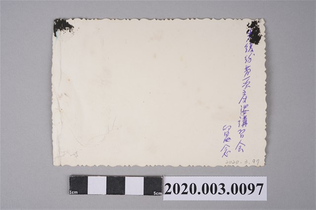 本文物為光復後第一次講習會合照,有15位助產士合影的照片,多數為耳際短髮,身穿短袖上衣與裙子。背面寫著「光復後第一次產婆講習會留念」。日本明治維新後,為了配合富國強兵政策,引進西方醫學。1907年臺灣總督府頒布「助產婦講習規則」,設立講習所,也設置專門培養臺灣產婆的速成科。日治時期臺灣早期婦女的生產方式是以產婆接生為主,產婆因而被賦予開立出生證明,政府藉此掌握人口出生數,為戶政制度奠下基礎。1945年日本戰敗後,國民政府在臺灣施行「助產士法」,對於接生者名稱從產婆改為「助產士」。隨著醫生法公佈,各項醫療措施多以醫生為主,助產士也需在醫師的指導下才能擔任接生工作,經過社會文化與醫療制度變遷,使得產婆所扮演角色漸漸被忽視。