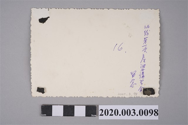 本文物為講習會上課照,有14位學員於衛生局訓練後合影的照片,皆為戴著帽子、口罩以及圍裙,右側那位女性,推測是授課老師。背面寫著「光復後第一次產婆講習會留念16.」。日本明治維新後,為了配合富國強兵政策,引進西方醫學。1907年臺灣總督府頒布「助產婦講習規則」,設立講習所,也設置專門培養臺灣產婆的速成科。日治時期臺灣早期婦女的生產方式是以產婆接生為主,產婆因而被賦予開立出生證明,政府藉此掌握人口出生數,為戶政制度奠下基礎。1945年日本戰敗後,國民政府在臺灣施行「助產士法」,對於接生者名稱從產婆改為「助產士」。隨著醫生法公佈,各項醫療措施多以醫生為主,助產士也需在醫師的指導下才能擔任接生工作,經過社會文化與醫療制度變遷,使得產婆所扮演角色漸漸被忽視。