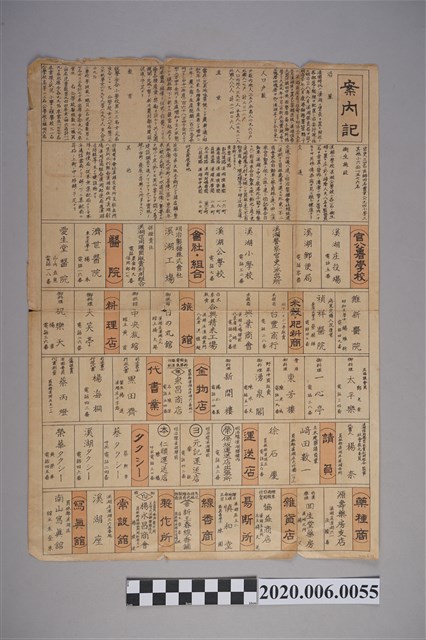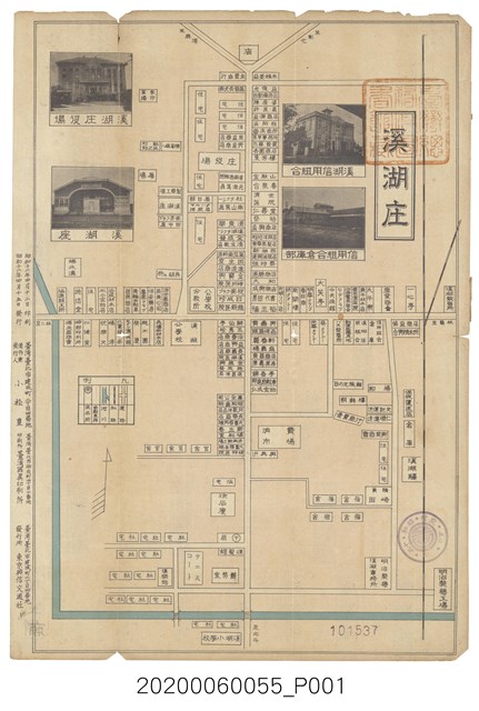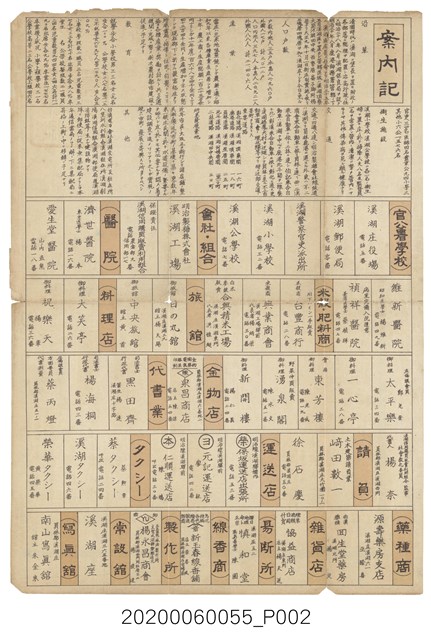 1.本物件為小松豊著作兼發行〈溪湖庄案內圖〉,方形紙張上畫有街道標示及店家名稱,地形方正規矩,上方並有4張黑白照片分別是「溪湖庄役場」、「溪湖座」、「溪湖信用組合」、「信用組合倉庫部」,圖中並載明許多重要地點,如溪湖公學校、明治製糖工場等,地圖最左邊並寫有著作者發行人小松豊與印刷所折井製版,還有發行所為東京興信交通社,整個物件保存尚可,僅有些許泛黃模糊。2.溪湖鎮位於臺灣彰化縣的地理中心,大正9年實施街庄制度,以二林上堡之頂寮、大突、溪湖、汴頭、田中央、西勢厝為主,合併馬芝堡的三塊厝、四塊厝,武西堡之崙子腳、阿媽厝,圈劃成立「溪湖庄」,轄屬臺中州員林郡,昭和13年升格為溪湖街,職業細圖主要目的在登錄當時之店家,並盡可能的將店名完整收錄於圖面上,因此僅能提供商家相關位置資訊而非絕對之地理空間位址,明細圖上之街道尺寸、角度、位置並非真實都市空間,經過調整後呈現出城市原始樣貌。