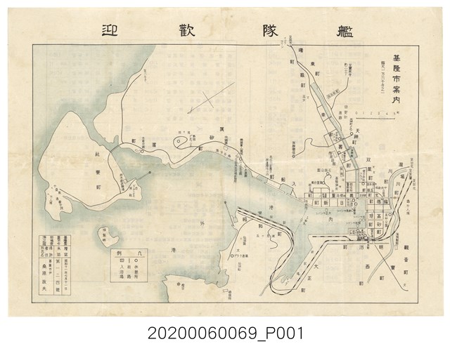 1.本物件為基隆市案內圖,方形紙張畫上彩色基隆港地圖,最上方寫有「艦隊歡迎」字樣,地圖上標明基隆市街道地分布以及外港、燈檯、檢疫所等資訊,地圖右上方還有1個比例尺,比例尺上方則寫有「基隆市案內 縮尺一万六千分之一」,並以黑筆寫下「1936.7.11」,地圖左下角則寫有「基隆要塞司令部檢查濟之證,並載明時間為昭和十一年七月十一日、第一二四號」以及得許者住所氏名為基隆市尹「桑原政夫」,就圖例來觀察,主要是向艦隊士兵提供休憩所和入浴場的指引地圖,整個物件外觀尚可,以一個透明塑膠袋封住,僅有些許斑駁泛黃。 2.基隆市以深水谷灣之天然港灣著名,乃臺灣最北端的都市,古名「雞籠」,日治時代後,日本將基隆建設為臺灣與日本內地的轉運樞紐,並從1899年開始到1935年進行了四期的基隆港築港工程,也是臺灣日治時代的第一大港,1920年,臺北州基隆郡設立,並另劃市區部分設置基隆街,1924年,基隆街升格為基隆市,為臺北州轄下的州轄市,乃基隆建市之始。