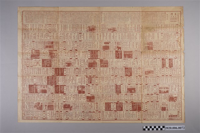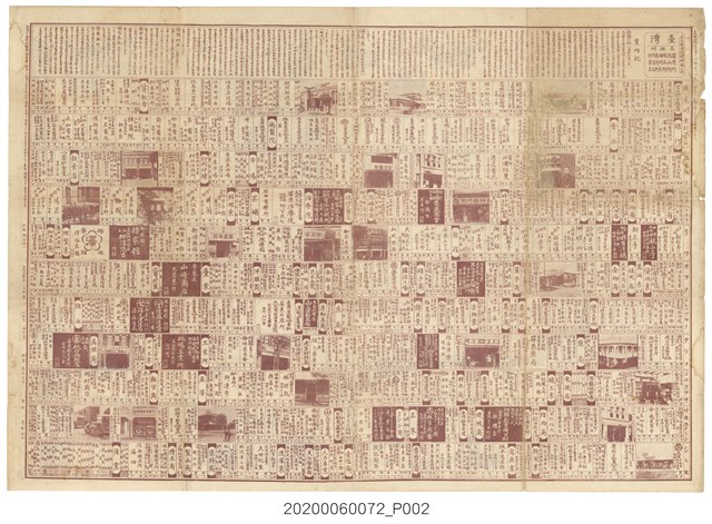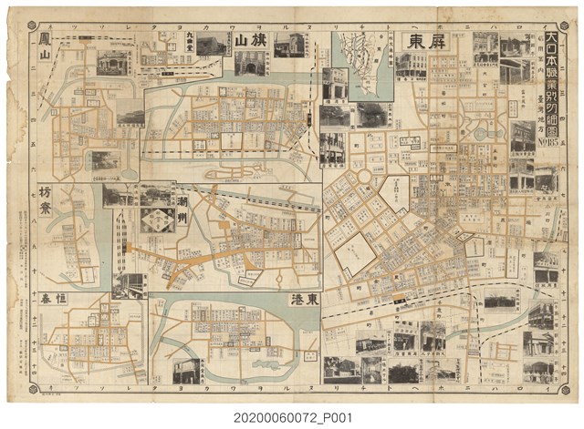 1.本物件為東京交通社發行〈大日本職業別明細圖:臺灣地方屏東地區〉,方形紙張上繪製有屏東地圖,主要行政區有「屏東」、「旗山」、「鳳山」、「潮州」、「枋寮」、「東港」、「恒春」,地圖上除了有街道分布外,還有各地代表性商家與景觀的黑白照片,地圖右上方寫有「大日本職業別明細圖No. 185」,左下方則寫有時間昭和十一年及發行人「木谷佐一」以及印刷所為「東京交通社印刷所」,圖內載明職業細圖,主要目的在登錄當時之店家,並盡可能的將店名完整收錄於圖面上,因此僅能提供商家相關位置資訊而非絕對之地理空間位址,明細圖上之街道尺寸、角度、位置並非真實都市空間,經過調整後呈現出城市原始樣貌,整個物件有明顯汙漬與泛黃痕跡。2.屏東市舊名「阿緱」或「雅猴」,原為平埔族阿猴社的故地,日治初設阿猴廳,1905年用字雅化為阿緱廳,廳治俱在今屏東市,1920年臺灣地方改制,以清代設立的屏東書院,將此地易名為「屏東」,設置屏東街隸屬屏東郡,1933年升格「屏東市」。