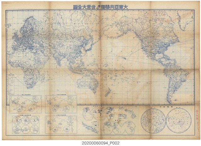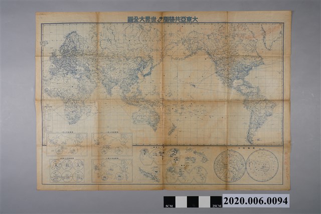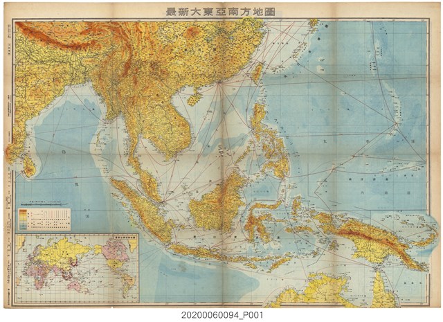 本物件為岩上方外著〈最新大東亞南方地圖〉。以彩色方式繪出最新大東亞南方地圖,以不同顏色的線條標示出各國地理位置,並載明經緯度,讓人看了一目了然,地圖最上方寫有「最新大東亞南方地圖」,地圖左邊寫有發行時間為昭和十八年,下方寫有著作者為岩上方外,以及發行所為文書堂,整個物件有些許泛黃與斑駁痕跡。