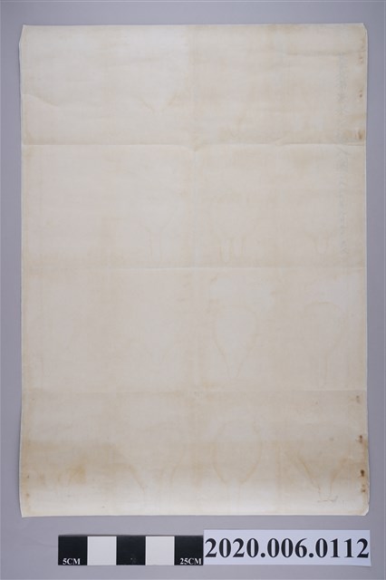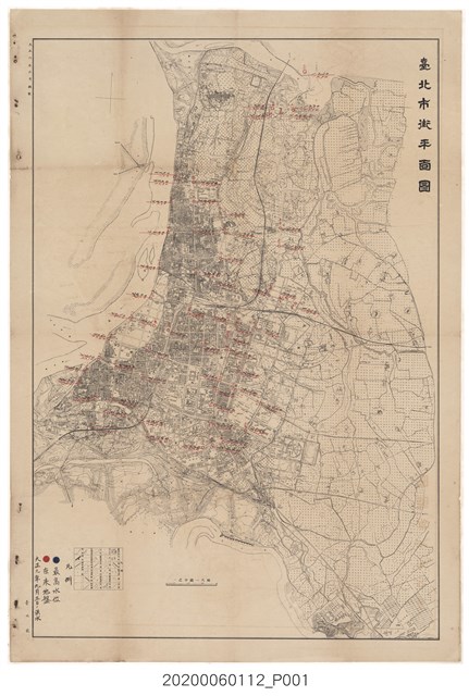 本物件為大正九年臺北市街洪水水位平面圖,該底圖為臺北廳製〈一萬分之一臺北市街平面圖〉,地圖印刷呈現臺北市街圖,左下方有凡例圖示及載明縮尺一萬分之一,以及「臺北廳」字樣,左上方則有繪製時間大正六年,地圖左下增註凡例,紅字標示為「在來地盤」、深藍色為「最高水位」,為大正九年九月三日之洪水水位標示。