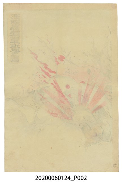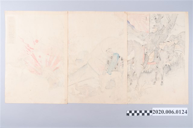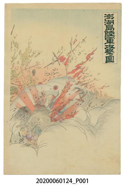 本物件為尾形月耕繪《澎湖島陸軍攻擊之圖》,方形紙張上畫有1彩色海報,主題為「澎湖島陸軍攻擊之圖」,紙張上繪有多個日本軍人,他們有的騎馬,有的徒步,有些手持軍刀,有些手持長槍進行攻擊,遠處烽火連天,左邊印有明治27年印刷,發行者為綾部半次郎,以及杉山彫栄,整個物件保存良好,僅有些許泛黃。2.澎湖之役是甲午戰爭末期清朝及大日本帝國和談期間,日本為了控制南中國海及獲得在和談時可要求割讓台灣之藉口而發動的戰役,當時日軍擊敗澎湖守軍,澎湖便成為日軍集結軍力進攻臺灣本島南部地區的基地。