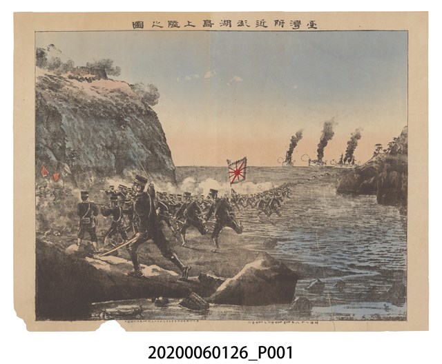 1.本物件為太田節次發行《臺灣附近澎湖島上陸之圖》,方形紙張上繪有一群日軍預備登陸澎湖島,日軍身著黑色軍服,頭戴軍帽,有持長槍有持長刀,以排為單位爬上島嶼,遠處有軍船,圖上寫有「臺灣附近澎湖島上陸之圖」,下方寫有時間為明治28年,另一邊寫有發行者為太田節次,整個物件保存良好,僅有些許泛黃。 2.澎湖之役是甲午戰爭末期清朝及大日本帝國和談期間,日本為了控制南中國海及獲得在和談時可要求割讓台灣之藉口而發動的戰役,當時日軍擊敗澎湖守軍,澎湖便成為日軍集結軍力進攻臺灣本島南部地區的基地。