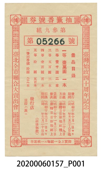 1.本物件為始政四十週年紀念臺灣博覽會導覽指南與抽籤券與明信片組,一共有1張照片、8張明信片、2本導覽指南以及1張抽籤券,最上面1張為始政四十週年紀念臺灣博覽會首員,共有7人,明信片則依照不同主題與會場而有不同,2本導覽指南則為林業館解說書以及臺灣博覽會會場案內說明,還有1張抽籤券的號碼為「05266」,所有物件以1個木框裱住收藏。 2.始政四十周年記念臺灣博覽會,簡稱臺灣博覽會,是1935年日本統治臺灣40週年時,於該年10月10日至11月28日此59日期間在臺灣各地所舉辦的博覽會,也是臺灣有史以來第大型博覽會,同時也是臺灣史上最大型的活動。臺灣總督府在每十年的施政紀念日 (日人稱為「始政記念日」)舉辦展覽會或博覽會這類的紀念性活動,1935年是第四回,其目的在於展現40年來日本政府在臺灣實施的各項建設成果,大力邀請周邊各國和地區參展,讓各國知曉臺灣各種進步情形經濟建設等等。