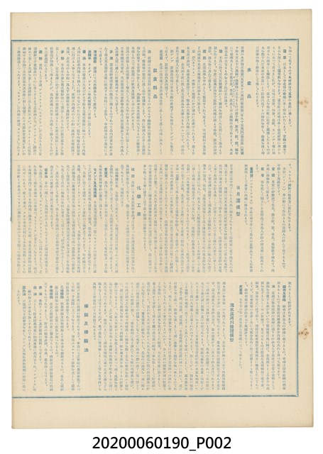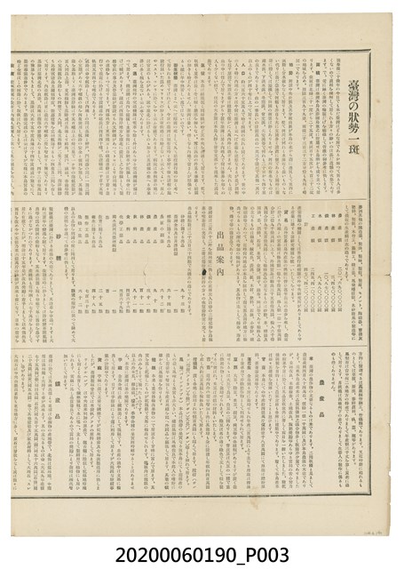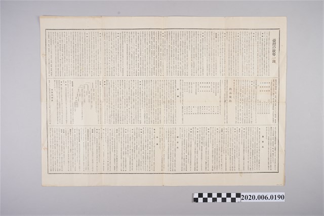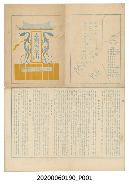1.本物件為博文館印平和紀念東京博覽會臺灣館案內,封面為白底,上面畫有1座寺廟,兩旁各有1隻龍圖形,中間寫有「臺灣館案內」,導覽內寫有臺灣館的現狀,還有此次參與展覽的物品,包含了水產品、飲料品、砂糖、化學工業與樟腦等,導覽上還印有「株式會社博文館印刷所」,整個物件因收藏關係,有些許斑駁與褪色。