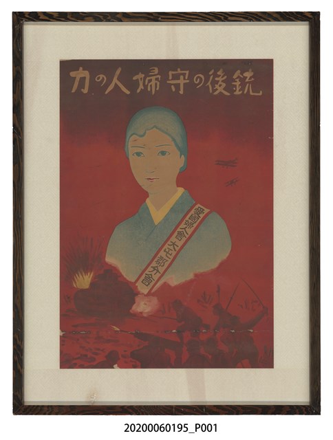 1.本物件為愛國婦人會大屯郡分會海報,海報中主要有1名女性,身著藍色日本和服,頭梳日本髮髻,身上揹1條布條「愛國負人會 大屯郡分會」,海報上方寫有「銃後の守婦人の力」,海報背景為紅色,下方並有烽火連天的圖案,整張海報保存良好,以1個木框裱住。