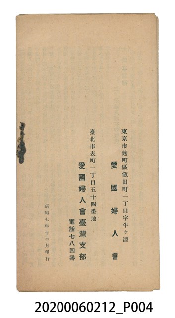 1.本物件為「愛國婦人會概況」,上面並蓋有其會章。2.愛國婦人會創始於1901年(明治34年),是由日本上流社會婦女所組成的團體,會員數於1919年(大正8年)突破100萬。臺灣的愛國婦人會屬於日本愛國婦人會分支,對象主要包括在臺日本婦人,並吸收本地士紳的夫人,主要從事女子教育及社會公益活動,1904年(明治37年)成立臺北、臺中、臺南三個支部,資金來源部分靠募捐,部分由政府當局支援。