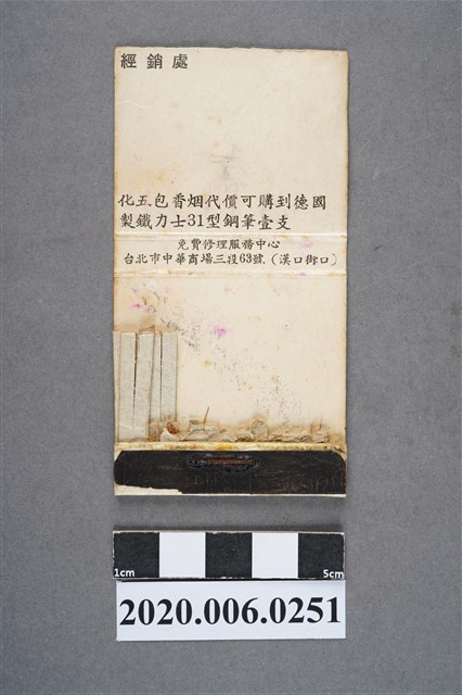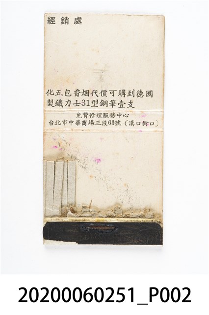 1.本件為數個火柴盒共同組成的文物。內容包含中華少棒球隊紀念火柴、國慶愛國火柴、各東物類或鐵力士鋼筆、三洋電視機等廣告的火柴盒,可以說是早期瓦斯爐尚不盛行,又可達到廣告宣傳的小小載體。2.日本公家單位也曾把火柴盒當作宣導文宣,包含交通安全或環境綠化等標語。臺灣方面,也學習日本將火柴盒作為廣告宣導的媒介(載體),在打火機與瓦斯爐普及前,火柴是臺灣重要的民生物資,因此火柴生產也行程專門產業,商家透過印製宣傳火柴盒作為贈品,用以販售或免費宣傳發送,盒面商標各具特色,例如臺灣火柴公司發行的「自由之火」火柴盒正面使用熊熊火把作為商標。