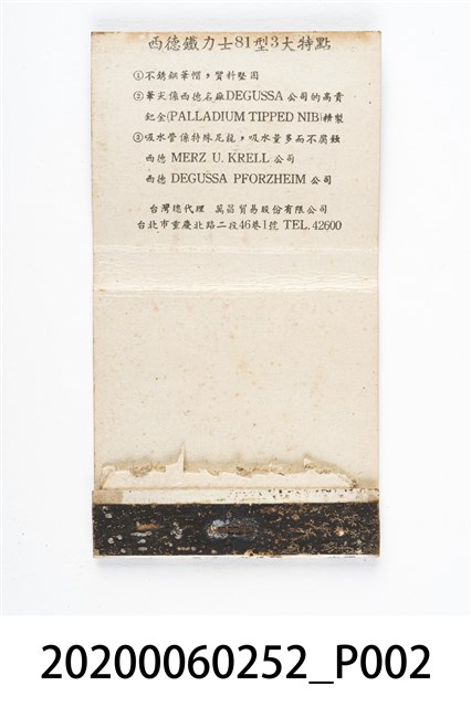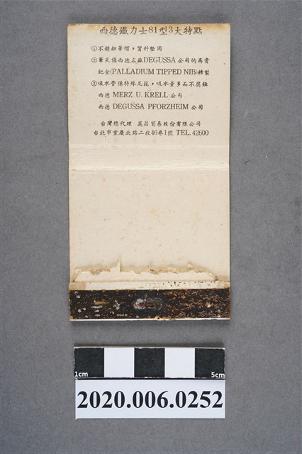 1.本件為數個火柴盒共同組成的文物。內容包含中華少棒球隊紀念火柴、國慶愛國火柴、各東物類或鐵力士鋼筆、三洋電視機等廣告的火柴盒,可以說是早期瓦斯爐尚不盛行,又可達到廣告宣傳的小小載體。2.日本公家單位也曾把火柴盒當作宣導文宣,包含交通安全或環境綠化等標語。臺灣方面,也學習日本將火柴盒作為廣告宣導的媒介(載體),在打火機與瓦斯爐普及前,火柴是臺灣重要的民生物資,因此火柴生產也行程專門產業,商家透過印製宣傳火柴盒作為贈品,用以販售或免費宣傳發送,盒面商標各具特色,例如臺灣火柴公司發行的「自由之火」火柴盒正面使用熊熊火把作為商標。