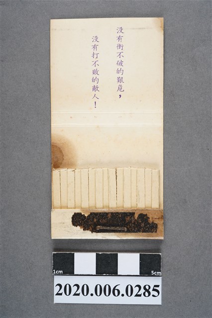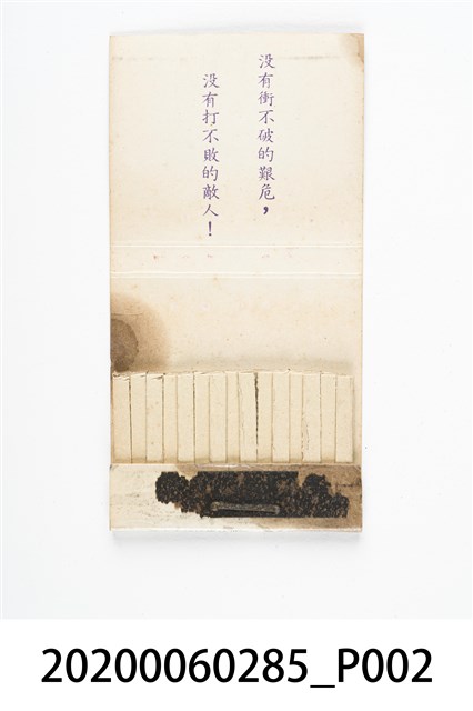 1.本件為數個火柴盒共同組成的文物。內容包含中華少棒球隊紀念火柴、國慶愛國火柴、各東物類或鐵力士鋼筆、三洋電視機等廣告的火柴盒,可以說是早期瓦斯爐尚不盛行,又可達到廣告宣傳的小小載體。2.日本公家單位也曾把火柴盒當作宣導文宣,包含交通安全或環境綠化等標語。臺灣方面,也學習日本將火柴盒作為廣告宣導的媒介(載體),在打火機與瓦斯爐普及前,火柴是臺灣重要的民生物資,因此火柴生產也行程專門產業,商家透過印製宣傳火柴盒作為贈品,用以販售或免費宣傳發送,盒面商標各具特色,例如臺灣火柴公司發行的「自由之火」火柴盒正面使用熊熊火把作為商標。