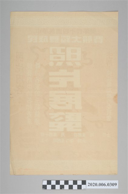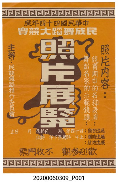 1.本件為中華民國四十四年度民族舞蹈大競賽照片展覽海報,寫著「民族舞蹈大競賽,照片展覽」字樣,照片內容有競賽期中的各種表演,舞蹈名家的示範鏡頭」,主辦單位為「民族舞蹈推行委員會」字樣,下方並指出「歡迎參觀 不收門票」。2.1952年,11月為提倡中華民族舞蹈發展,由教育部、國防部、內政部聯合倡組「民族舞蹈推行委員會」,聘請國內舞蹈加、音樂家、美術家、攝影家等專家擔任委員。1964年5月5日,更名為「中華民族舞蹈學會」。1976年5月5日,為推動全國舞蹈性發展,更名為「中華民國舞蹈學會」。