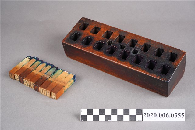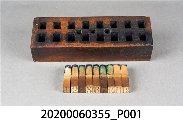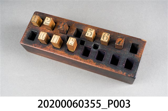 1.本物件為真花園號碼章,為木頭製品,底座為1塊很厚長方形木條,木條上面鑿了各8個的洞,另外又做了號碼章,大小剛好可以將章放進底座,目前有的號碼章為1、2、3、5、6、7、10、11、12,整個物件保存完整,唯有明顯斑駁與使用過痕跡。 2. 1907年日本頒布法令,准許台灣人開設妓院,1922年(大正11年)臺南州政府將臺南市內的貸座敷(特種行業)集中在新町以便於管理和整頓風紀,1930年代,府城人戲稱『第一賣冰,第二醫生,第三新町,第四跤筲間』,足以印證特種行業極盛的曾經,隨著日本的戰敗,臺灣經營者面臨政府1946年的廢除公娼、肅娼而難以為繼,最終僅存的日治時期享有盛名的妓女戶之二:新松金樓,已於2005年已經拆除;真花園(臺南市康樂街19號),1座完整的四合院建築,屋主在無力維修的情況下,於2009年05月20日拆下招牌,這也代表真花園是最後一間見證新町歷史的有牌妓女戶,走入歷史。