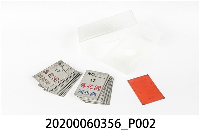 1.本物件為真花園宿夜票與時間票,為鐵製品,分為兩種,橘色字體的為時間票,藍色字體的為宿業票,兩者上面皆有號碼以及寫上「真花園」,旁邊有1個白色塑膠長方盒,可以將票券收納於此,整個物件保存完整。