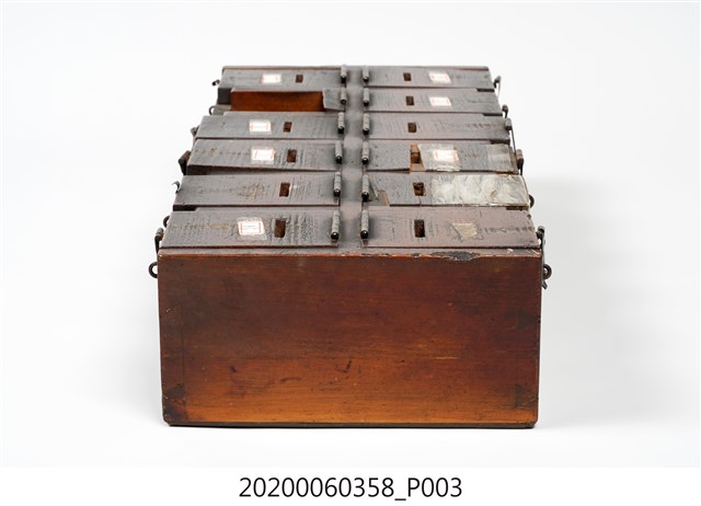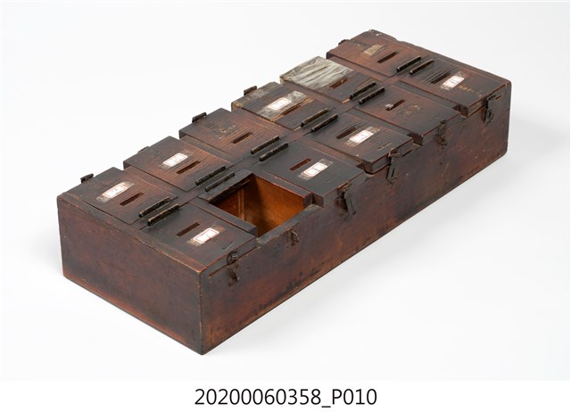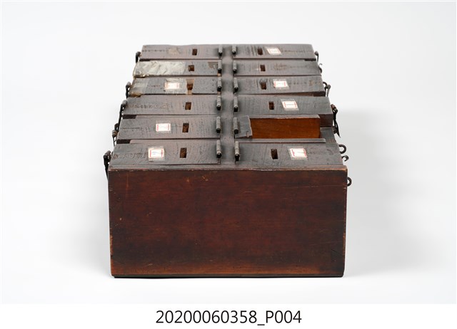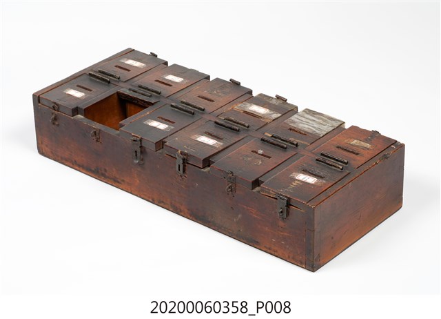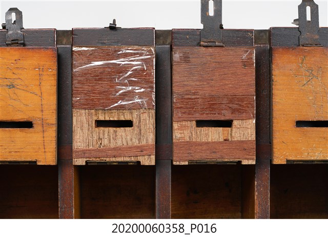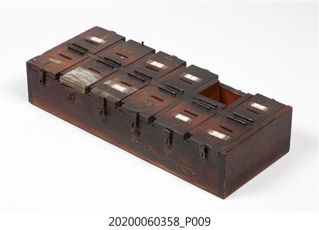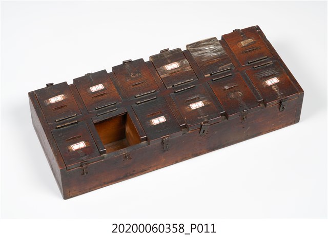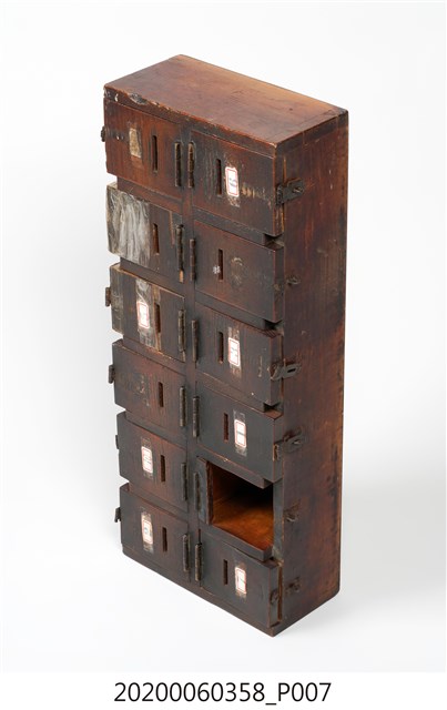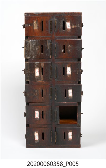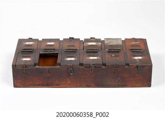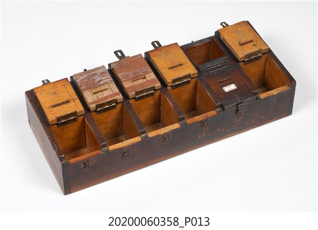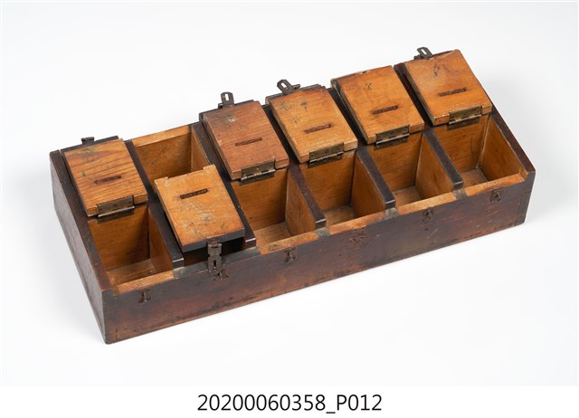 1.本物件為木製真花園統計號碼箱,其外觀為1大型木製箱子,裡面隔有每排6個的箱子,一共2排,上排箱子的蓋子為上掀式,並在上方有鎖頭裝置,下排箱子為下掀式,在最下面有鎖頭裝置,箱子蓋子皆有1白底紅框的標籤紙上並印有號碼,每個蓋子上有1小的長方形小洞,可以窺見箱子內,整個物件保存尚可,唯下排左2的蓋子已經毀損。 2. 1907年日本頒布法令,准許台灣人開設妓院,1922年(大正11年)臺南州政府將臺南市內的貸座敷(特種行業)集中在新町以便於管理和整頓風紀,1930年代,府城人戲稱『第一賣冰,第二醫生,第三新町,第四跤筲間』,足以印證特種行業極盛的曾經,隨著日本的戰敗,台灣經營者面臨政府1946年的廢除公娼、肅娼而難以為繼,最終僅存的日治時期享有盛名的妓女戶之二:新松金樓,已於2005年已經拆除;真花園(臺南市康樂街19號),1座完整的四合院建築,屋主在無力維修的情況下,於2009年05月20日拆下招牌,這也代表真花園是最後一間見證新町歷史的有牌妓女戶,走入歷史。