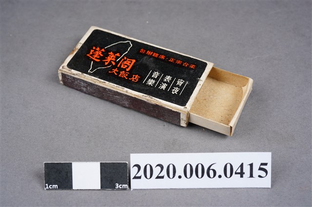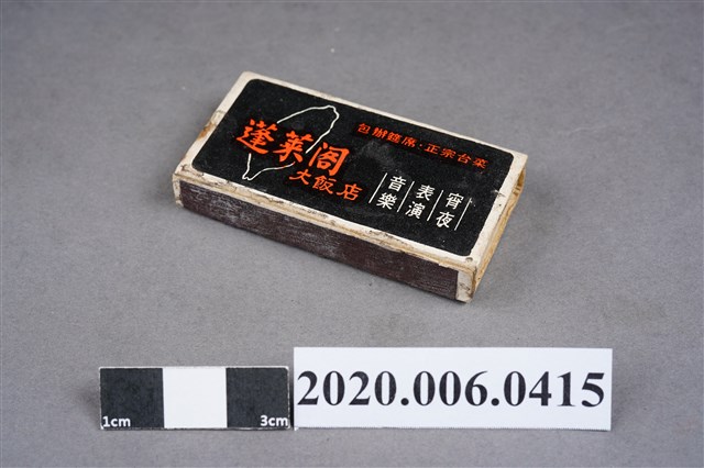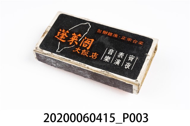 1.餐廳、飯店為主等廣告的火柴盒,可以說是早期瓦斯爐尚不盛行,又可達到廣告宣傳的小小載體。而火柴盒上通常有商家中英文名稱、商標或電話,偶有營業品項或設備,如桃花鄉酒家有電話與強調有冷暖設備、春成八卦窯則強調自家為「專製紅磚」、百利餐廳宣傳自家為法式西餐、飲料名酒、喜慶宴席、正宗中菜等。 2.臺灣在打火機與瓦斯爐普及前,火柴是臺灣重要的民生物資,因此火柴生產也行程專門產業,商家透過印製宣傳火柴盒作為贈品,用以販售或免費宣傳發送,盒面商標各具特色,例如臺灣火柴公司發行的「自由之火」火柴盒正面使用熊熊火把作為商標。而本件文物則有各家飯店的名稱,如圓山大飯店、希爾頓大飯店、六福客棧等,皆是現今仍持續營業的商家。