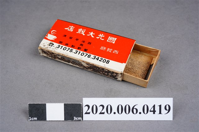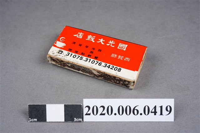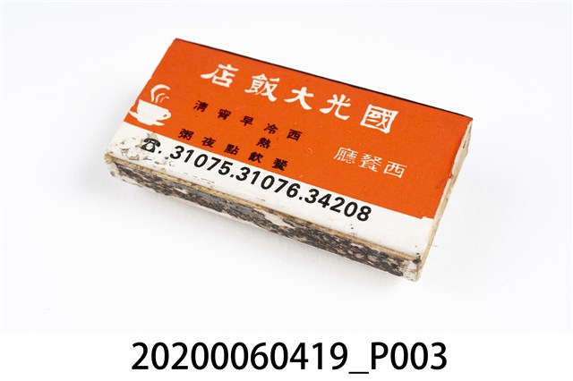 1.餐廳、飯店為主等廣告的火柴盒,可以說是早期瓦斯爐尚不盛行,又可達到廣告宣傳的小小載體。而火柴盒上通常有商家中英文名稱、商標或電話,偶有營業品項或設備,如桃花鄉酒家有電話與強調有冷暖設備、春成八卦窯則強調自家為「專製紅磚」、百利餐廳宣傳自家為法式西餐、飲料名酒、喜慶宴席、正宗中菜等。 2.臺灣在打火機與瓦斯爐普及前,火柴是臺灣重要的民生物資,因此火柴生產也行程專門產業,商家透過印製宣傳火柴盒作為贈品,用以販售或免費宣傳發送,盒面商標各具特色,例如臺灣火柴公司發行的「自由之火」火柴盒正面使用熊熊火把作為商標。而本件文物則有各家飯店的名稱,如圓山大飯店、希爾頓大飯店、六福客棧等,皆是現今仍持續營業的商家。