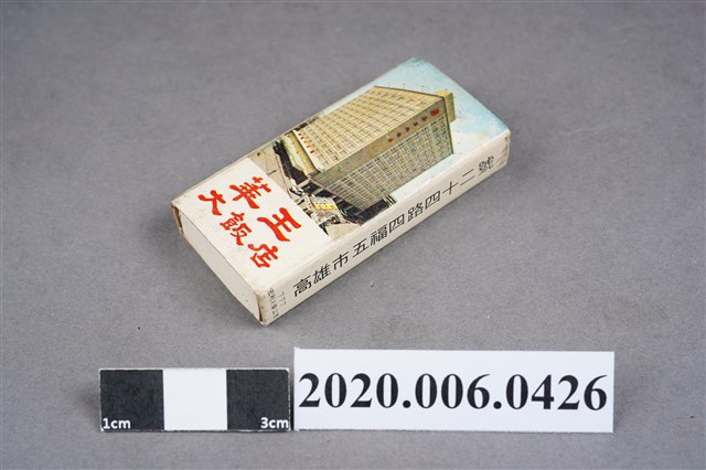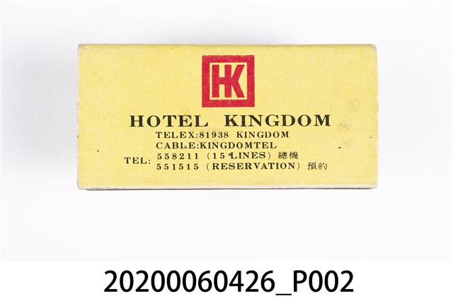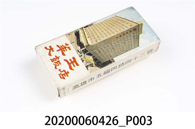 1.餐廳、飯店為主等廣告的火柴盒,可以說是早期瓦斯爐尚不盛行,又可達到廣告宣傳的小小載體。而火柴盒上通常有商家中英文名稱、商標或電話,偶有營業品項或設備,如桃花鄉酒家有電話與強調有冷暖設備、春成八卦窯則強調自家為「專製紅磚」、百利餐廳宣傳自家為法式西餐、飲料名酒、喜慶宴席、正宗中菜等。 2.臺灣在打火機與瓦斯爐普及前,火柴是臺灣重要的民生物資,因此火柴生產也行程專門產業,商家透過印製宣傳火柴盒作為贈品,用以販售或免費宣傳發送,盒面商標各具特色,例如臺灣火柴公司發行的「自由之火」火柴盒正面使用熊熊火把作為商標。而本件文物則有各家飯店的名稱,如圓山大飯店、希爾頓大飯店、六福客棧等,皆是現今仍持續營業的商家。