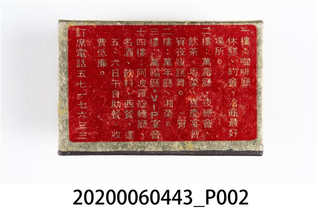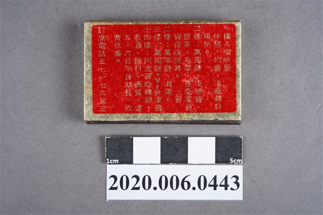 1.餐廳、飯店為主等廣告的火柴盒,可以說是早期瓦斯爐尚不盛行,又可達到廣告宣傳的小小載體。而火柴盒上通常有商家中英文名稱、商標或電話,偶有營業品項或設備,如桃花鄉酒家有電話與強調有冷暖設備、春成八卦窯則強調自家為「專製紅磚」、百利餐廳宣傳自家為法式西餐、飲料名酒、喜慶宴席、正宗中菜等。 2.臺灣在打火機與瓦斯爐普及前,火柴是臺灣重要的民生物資,因此火柴生產也行程專門產業,商家透過印製宣傳火柴盒作為贈品,用以販售或免費宣傳發送,盒面商標各具特色,例如臺灣火柴公司發行的「自由之火」火柴盒正面使用熊熊火把作為商標。而本件文物則有各家飯店的名稱,如圓山大飯店、希爾頓大飯店、六福客棧等,皆是現今仍持續營業的商家。