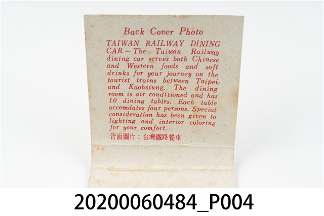 1.餐廳、飯店為主等廣告的火柴盒,可以說是早期瓦斯爐尚不盛行,又可達到廣告宣傳的小小載體。而火柴盒上通常有商家中英文名稱、商標或電話,偶有營業品項或設備,如桃花鄉酒家有電話與強調有冷暖設備、春成八卦窯則強調自家為「專製紅磚」、百利餐廳宣傳自家為法式西餐、飲料名酒、喜慶宴席、正宗中菜等。 2.臺灣在打火機與瓦斯爐普及前,火柴是臺灣重要的民生物資,因此火柴生產也行程專門產業,商家透過印製宣傳火柴盒作為贈品,用以販售或免費宣傳發送,盒面商標各具特色,例如臺灣火柴公司發行的「自由之火」火柴盒正面使用熊熊火把作為商標。而本件文物則有各家飯店的名稱,如圓山大飯店、希爾頓大飯店、六福客棧等,皆是現今仍持續營業的商家。