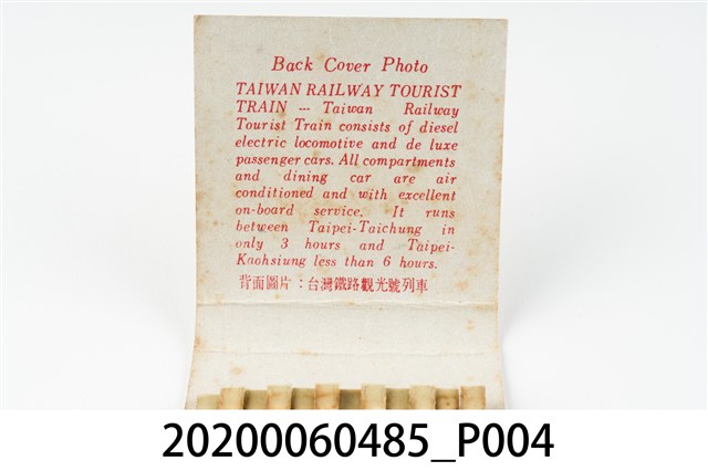 1.餐廳、飯店為主等廣告的火柴盒,可以說是早期瓦斯爐尚不盛行,又可達到廣告宣傳的小小載體。而火柴盒上通常有商家中英文名稱、商標或電話,偶有營業品項或設備,如桃花鄉酒家有電話與強調有冷暖設備、春成八卦窯則強調自家為「專製紅磚」、百利餐廳宣傳自家為法式西餐、飲料名酒、喜慶宴席、正宗中菜等。 2.臺灣在打火機與瓦斯爐普及前,火柴是臺灣重要的民生物資,因此火柴生產也行程專門產業,商家透過印製宣傳火柴盒作為贈品,用以販售或免費宣傳發送,盒面商標各具特色,例如臺灣火柴公司發行的「自由之火」火柴盒正面使用熊熊火把作為商標。而本件文物則有各家飯店的名稱,如圓山大飯店、希爾頓大飯店、六福客棧等,皆是現今仍持續營業的商家。