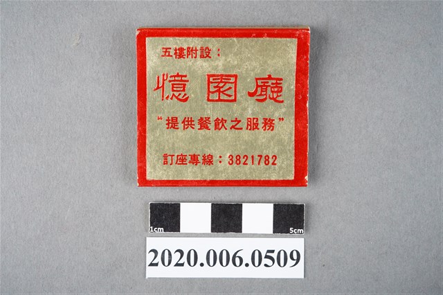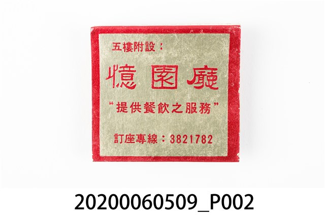 1.餐廳、飯店為主等廣告的火柴盒,可以說是早期瓦斯爐尚不盛行,又可達到廣告宣傳的小小載體。而火柴盒上通常有商家中英文名稱、商標或電話,偶有營業品項或設備,如桃花鄉酒家有電話與強調有冷暖設備、春成八卦窯則強調自家為「專製紅磚」、百利餐廳宣傳自家為法式西餐、飲料名酒、喜慶宴席、正宗中菜等。 2.臺灣在打火機與瓦斯爐普及前,火柴是臺灣重要的民生物資,因此火柴生產也行程專門產業,商家透過印製宣傳火柴盒作為贈品,用以販售或免費宣傳發送,盒面商標各具特色,例如臺灣火柴公司發行的「自由之火」火柴盒正面使用熊熊火把作為商標。而本件文物則有各家飯店的名稱,如圓山大飯店、希爾頓大飯店、六福客棧等,皆是現今仍持續營業的商家。