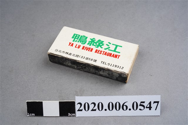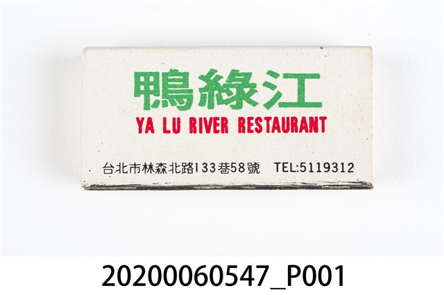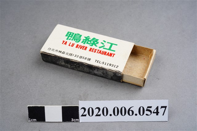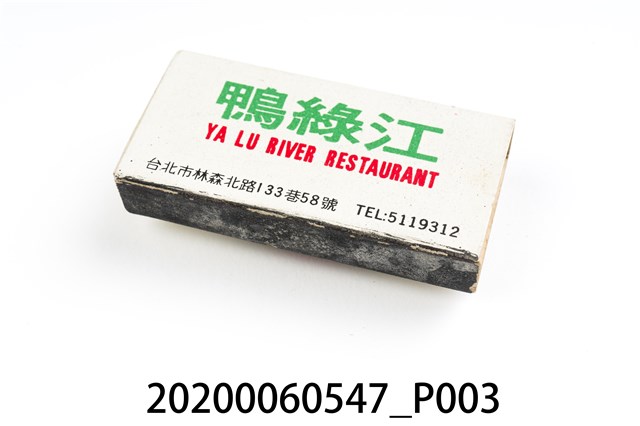 1.餐廳、飯店為主等廣告的火柴盒,可以說是早期瓦斯爐尚不盛行,又可達到廣告宣傳的小小載體。火柴盒的外觀也不限於僅有四角形,開始出現六角形或長方形盒裝,也有外觀如小屋子的造型。 2.臺灣在打火機與瓦斯爐普及前,火柴是臺灣重要的民生物資,因此火柴生產也行程專門產業,商家透過印製宣傳火柴盒作為贈品,用以販售或免費宣傳發送,盒面商標各具特色,例如臺灣火柴公司發行的「自由之火」火柴盒正面使用熊熊火把作為商標。而本件文物則有各家飯店的名稱,有些火柴盒側邊會有廣告公司與或火柴製造商,如有國榮廣告火柴公司承製、地址為新竹市中正路18號(火車站前)、電話則有各地專線(新竹、臺北、高雄)。也隨著火柴廣告公司的出現,火柴盒的廣告呈現方式也有所不同,如部份有明的商家則簡單陳述「臺北‧華西街 台南担仔麵」名稱。