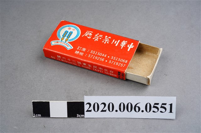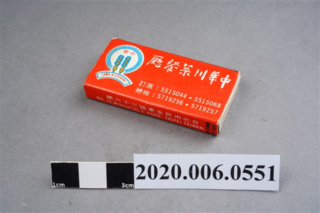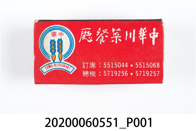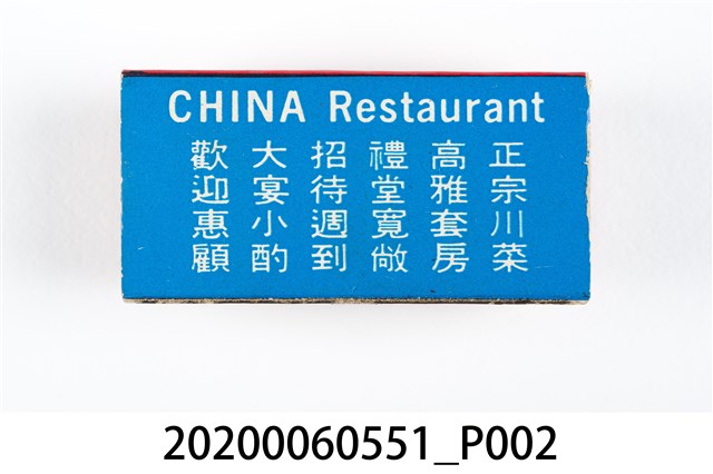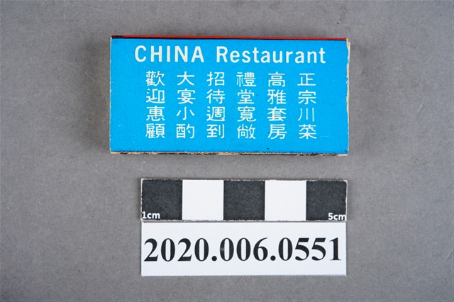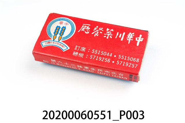 1.餐廳、飯店為主等廣告的火柴盒,可以說是早期瓦斯爐尚不盛行,又可達到廣告宣傳的小小載體。火柴盒的外觀也不限於僅有四角形,開始出現六角形或長方形盒裝,也有外觀如小屋子的造型。 2.臺灣在打火機與瓦斯爐普及前,火柴是臺灣重要的民生物資,因此火柴生產也行程專門產業,商家透過印製宣傳火柴盒作為贈品,用以販售或免費宣傳發送,盒面商標各具特色,例如臺灣火柴公司發行的「自由之火」火柴盒正面使用熊熊火把作為商標。而本件文物則有各家飯店的名稱,有些火柴盒側邊會有廣告公司與或火柴製造商,如有國榮廣告火柴公司承製、地址為新竹市中正路18號(火車站前)、電話則有各地專線(新竹、臺北、高雄)。也隨著火柴廣告公司的出現,火柴盒的廣告呈現方式也有所不同,如部份有明的商家則簡單陳述「臺北‧華西街 台南担仔麵」名稱。