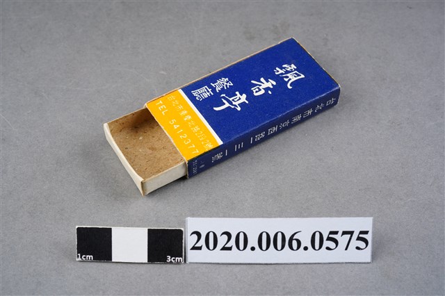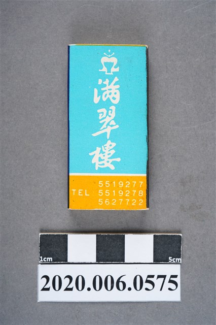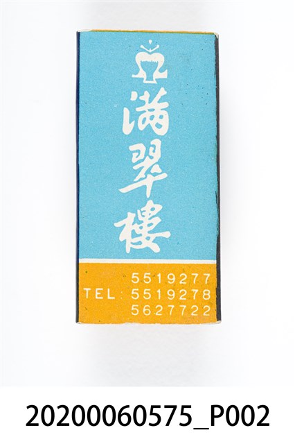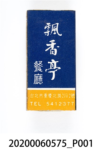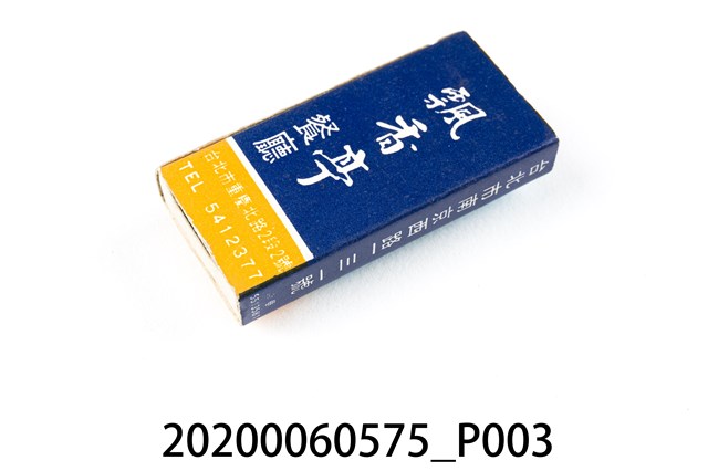 1.餐廳、飯店為主等廣告的火柴盒,可以說是早期瓦斯爐尚不盛行,又可達到廣告宣傳的小小載體。火柴盒的外觀也不限於僅有四角形,開始出現六角形或長方形盒裝,也有外觀如小屋子的造型。 2.臺灣在打火機與瓦斯爐普及前,火柴是臺灣重要的民生物資,因此火柴生產也行程專門產業,商家透過印製宣傳火柴盒作為贈品,用以販售或免費宣傳發送,盒面商標各具特色,例如臺灣火柴公司發行的「自由之火」火柴盒正面使用熊熊火把作為商標。而本件文物則有各家飯店的名稱,有些火柴盒側邊會有廣告公司與或火柴製造商,如有國榮廣告火柴公司承製、地址為新竹市中正路18號(火車站前)、電話則有各地專線(新竹、臺北、高雄)。也隨著火柴廣告公司的出現,火柴盒的廣告呈現方式也有所不同,如部份有明的商家則簡單陳述「臺北‧華西街 台南担仔麵」名稱。