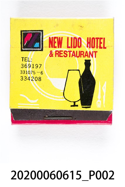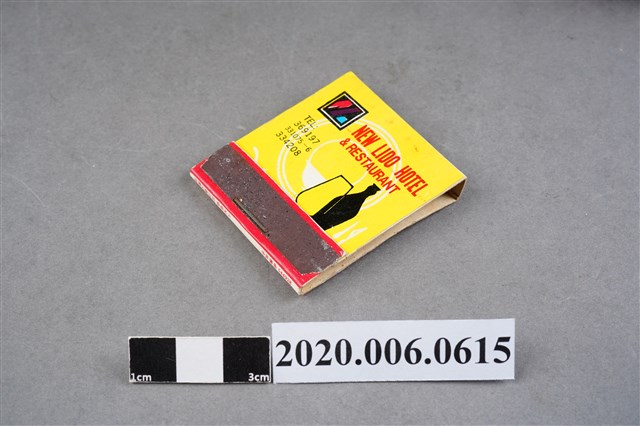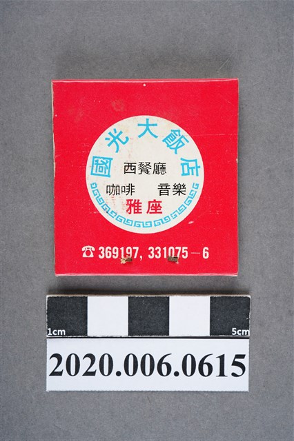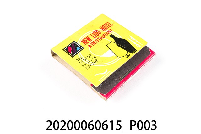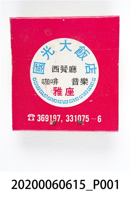1.餐廳、飯店為主等廣告的火柴盒,可以說是早期瓦斯爐尚不盛行,又可達到廣告宣傳的小小載體。火柴盒的外觀也不限於僅有四角形,開始出現六角形或長方形盒裝,也有外觀如小屋子的造型。 2.臺灣在打火機與瓦斯爐普及前,火柴是臺灣重要的民生物資,因此火柴生產也行程專門產業,商家透過印製宣傳火柴盒作為贈品,用以販售或免費宣傳發送,盒面商標各具特色,例如臺灣火柴公司發行的「自由之火」火柴盒正面使用熊熊火把作為商標。而本件文物則有各家飯店的名稱,有些火柴盒側邊會有廣告公司與或火柴製造商,如有國榮廣告火柴公司承製、地址為新竹市中正路18號(火車站前)、電話則有各地專線(新竹、臺北、高雄)。也隨著火柴廣告公司的出現,火柴盒的廣告呈現方式也有所不同,如部份有明的商家則簡單陳述「臺北‧華西街 台南担仔麵」名稱。