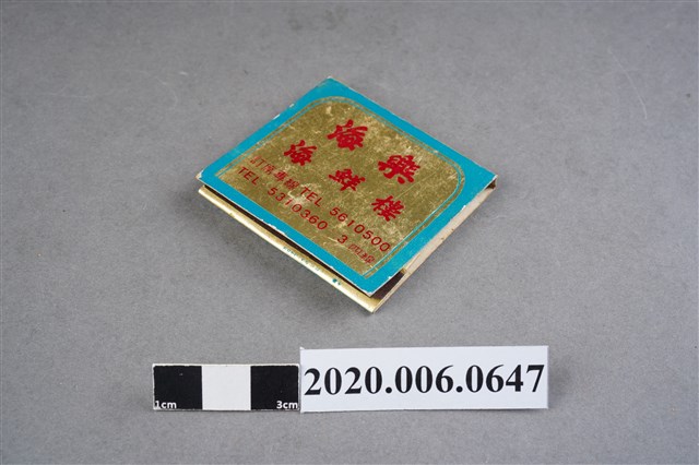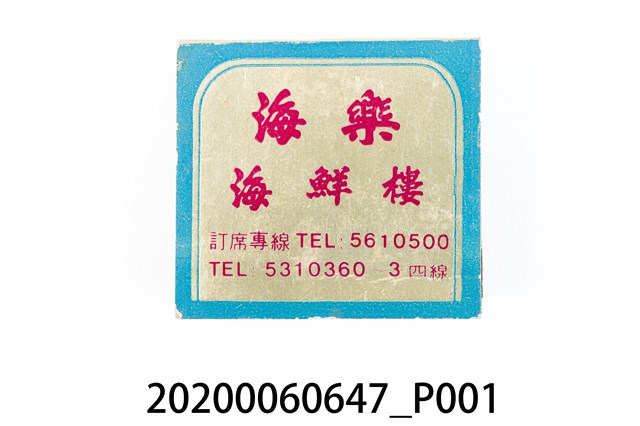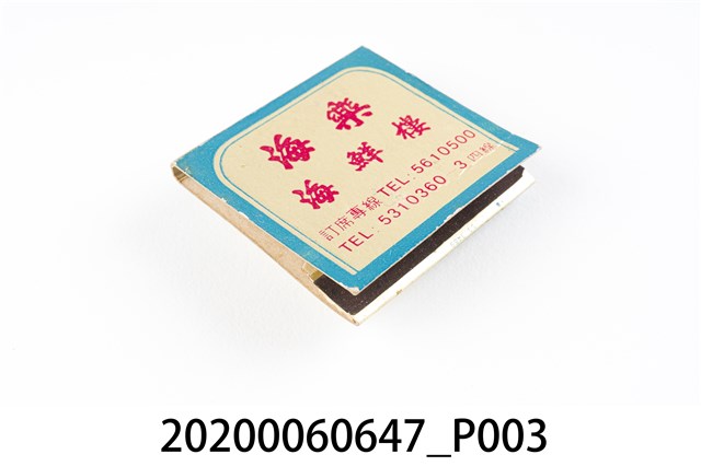 1.餐廳、飯店為主等廣告的火柴盒,可以說是早期瓦斯爐尚不盛行,又可達到廣告宣傳的小小載體。火柴盒的外觀也不限於僅有四角形,開始出現六角形或長方形盒裝,也有外觀如小屋子的造型。 2.臺灣在打火機與瓦斯爐普及前,火柴是臺灣重要的民生物資,因此火柴生產也行程專門產業,商家透過印製宣傳火柴盒作為贈品,用以販售或免費宣傳發送,盒面商標各具特色,例如臺灣火柴公司發行的「自由之火」火柴盒正面使用熊熊火把作為商標。而本件文物則有各家飯店的名稱,有些火柴盒側邊會有廣告公司與或火柴製造商,如有國榮廣告火柴公司承製、地址為新竹市中正路18號(火車站前)、電話則有各地專線(新竹、臺北、高雄)。也隨著火柴廣告公司的出現,火柴盒的廣告呈現方式也有所不同,如部份有明的商家則簡單陳述「臺北‧華西街 台南担仔麵」名稱。