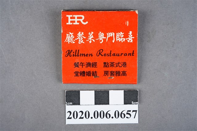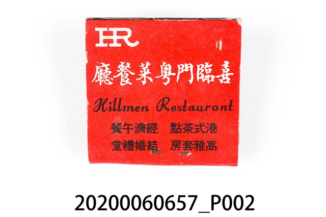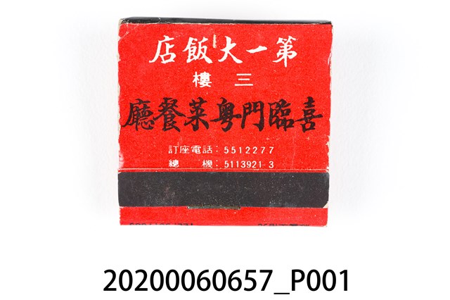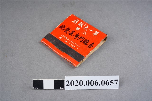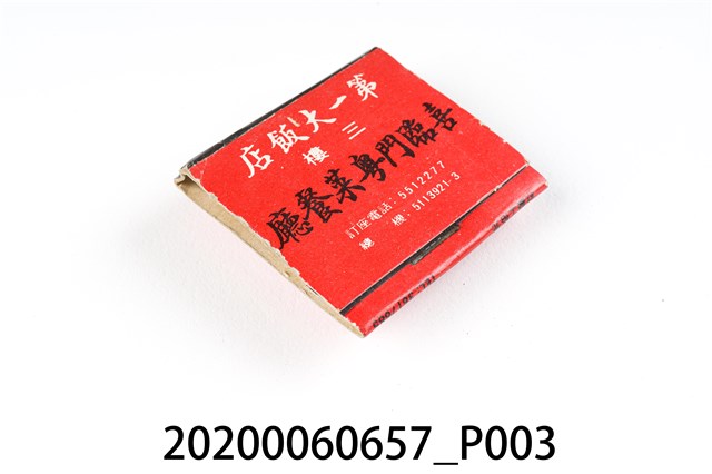 1.餐廳、飯店為主等廣告的火柴盒,可以說是早期瓦斯爐尚不盛行,又可達到廣告宣傳的小小載體。火柴盒的外觀也不限於僅有四角形,開始出現六角形或長方形盒裝,也有外觀如小屋子的造型。 2.臺灣在打火機與瓦斯爐普及前,火柴是臺灣重要的民生物資,因此火柴生產也行程專門產業,商家透過印製宣傳火柴盒作為贈品,用以販售或免費宣傳發送,盒面商標各具特色,例如臺灣火柴公司發行的「自由之火」火柴盒正面使用熊熊火把作為商標。而本件文物則有各家飯店的名稱,有些火柴盒側邊會有廣告公司與或火柴製造商,如有國榮廣告火柴公司承製、地址為新竹市中正路18號(火車站前)、電話則有各地專線(新竹、臺北、高雄)。也隨著火柴廣告公司的出現,火柴盒的廣告呈現方式也有所不同,如部份有明的商家則簡單陳述「臺北‧華西街 台南担仔麵」名稱。